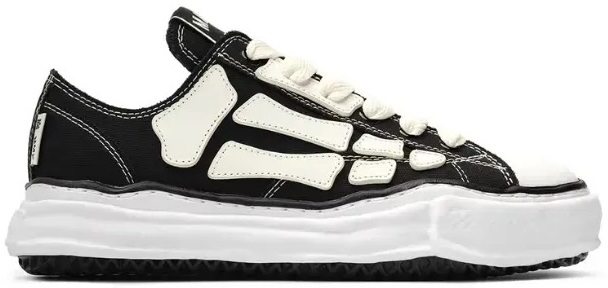 Sneakers com cabedal em canvas adornado com o icônico aplique “Bones” em couro napa da AMIRI, apoiados na sola artesanal original moldada em argila da Maison MIHARA YASUHIRO. A versão preta exibe detalhes em costura branca, criando um contraste marcante que ressalta sua estética escultural e premium.